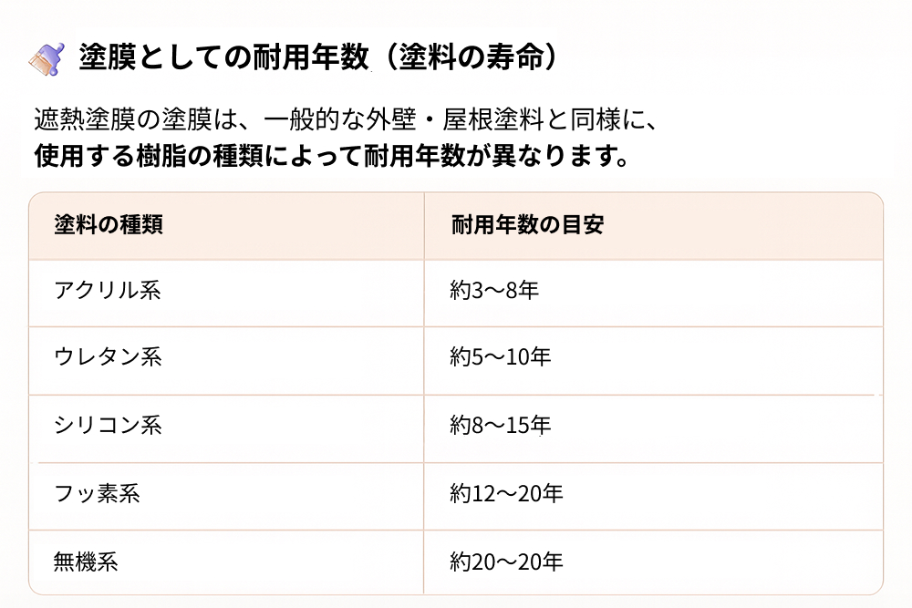 遮熱性能は塗膜の劣化や汚れの蓄積により、5〜7年程度で徐々に低下する傾向があります。