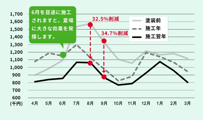 塗装前後の電気使用量比較では、夏季4ヶ月間で約18%(約150万円)削減